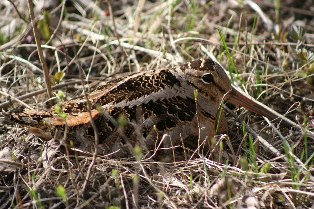 An American Woodcock camouflaged in a ground nest.